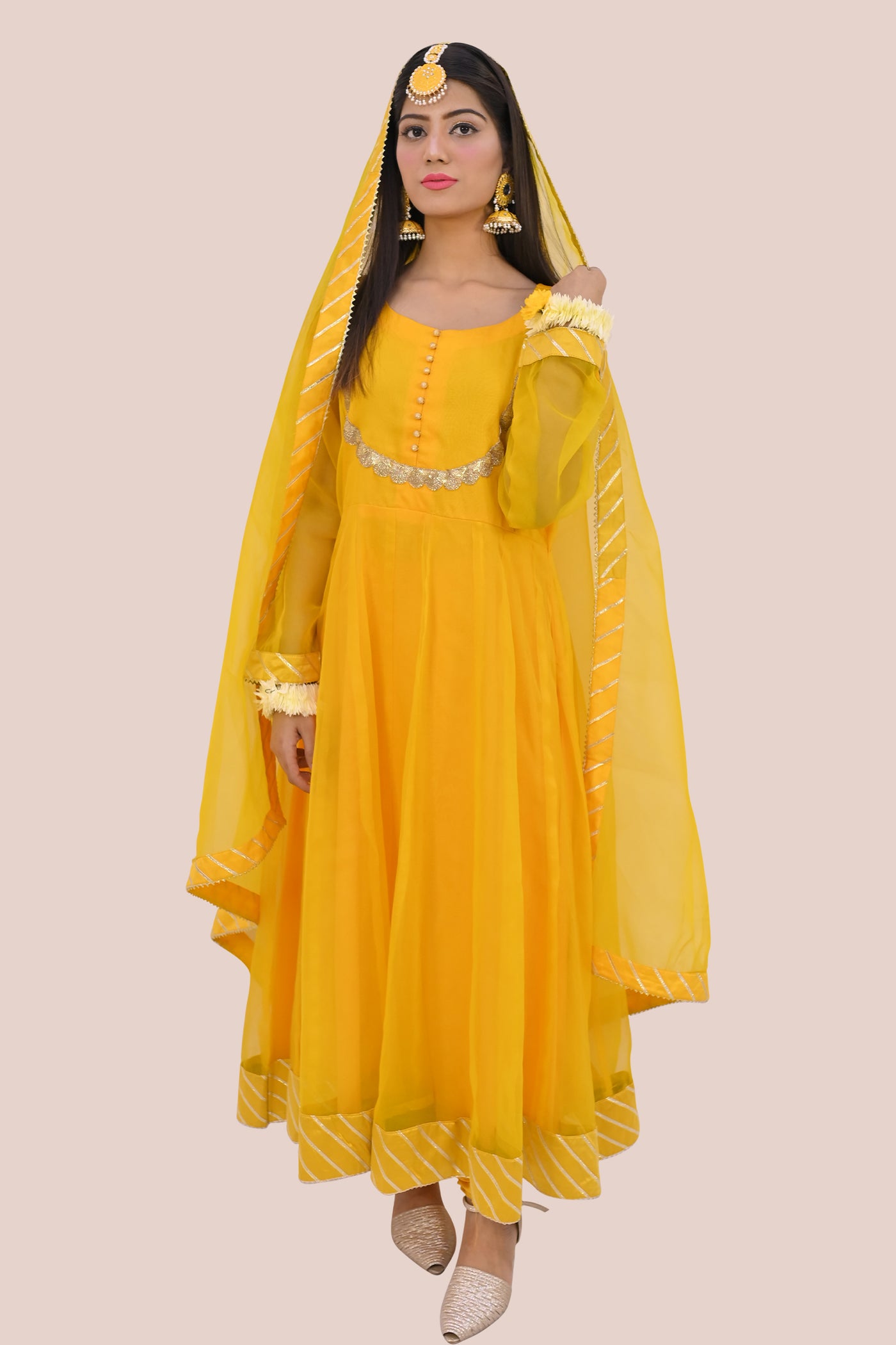 This frock is designed by the gota lace ,rubbin work and The frock features a round neckline with a row of decorative fabric buttons The neckline and front yoke are adorned with intricate golden lace or embellishments, adding a touch of elegance to the outfit. The sleeves are long and sheer, with the cuffs adorned with similar golden lace.