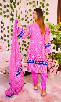 front center panel designed with embroidery colorful patches, border line with silk Patti duppata designed same as shirt and silk trouser